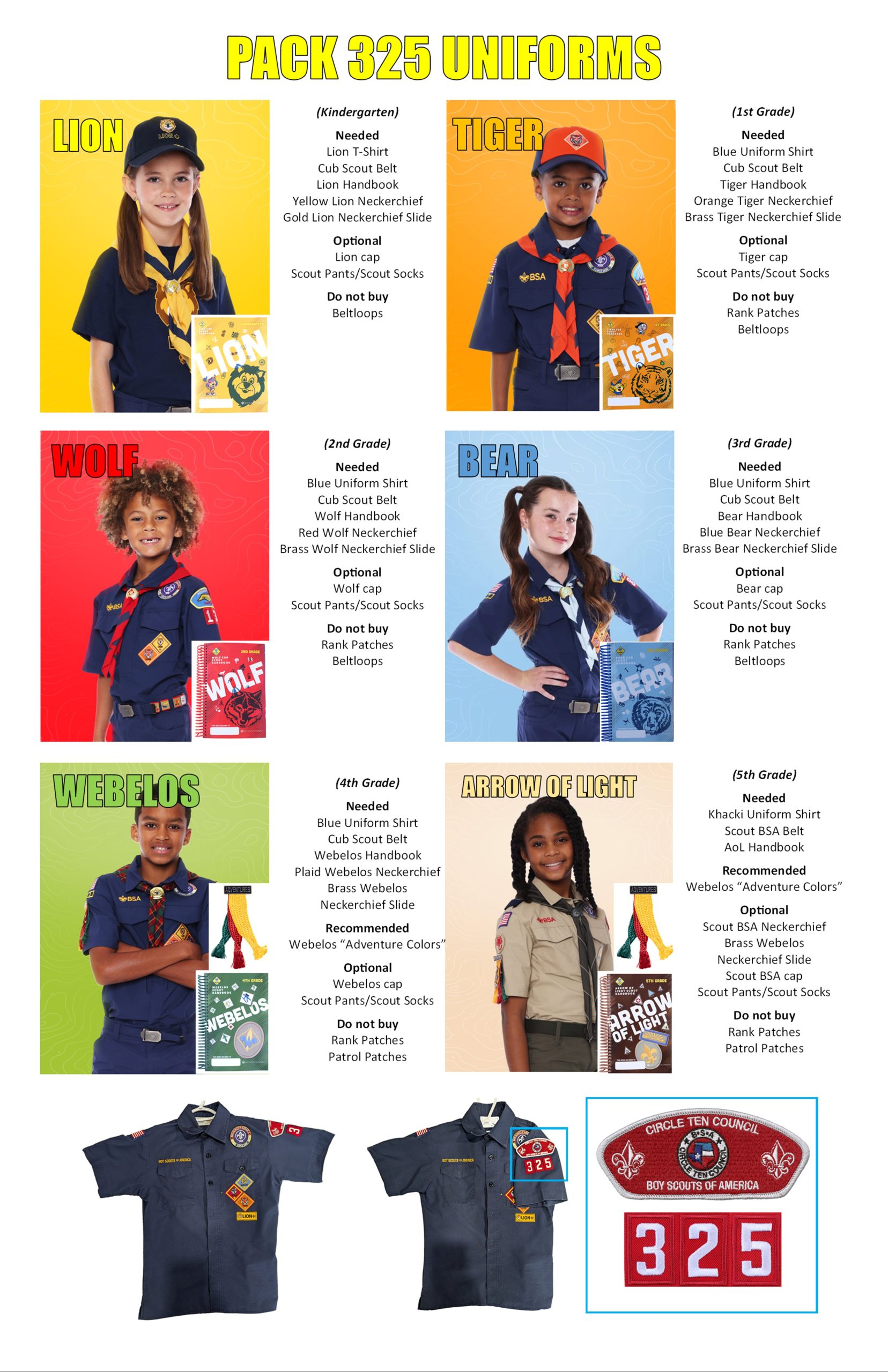The uniform is one of the methods of delivering the Scouting program. In addition to creating a sense of belonging, the uniform gives a Scout the ability to display their personal achievements. Uniforms also help distinguish the level of a child within the program and can also make it easier to keep track of our Scouts at big events. Our leaders should always be in full uniform to set a good example and to show that they, too, are part of the Den and Pack. Both Scouts and Leaders in our Pack utilize a Class A uniform which is the official BSA uniform and a Class B uniform that is less formal and works well for outdoor activities.